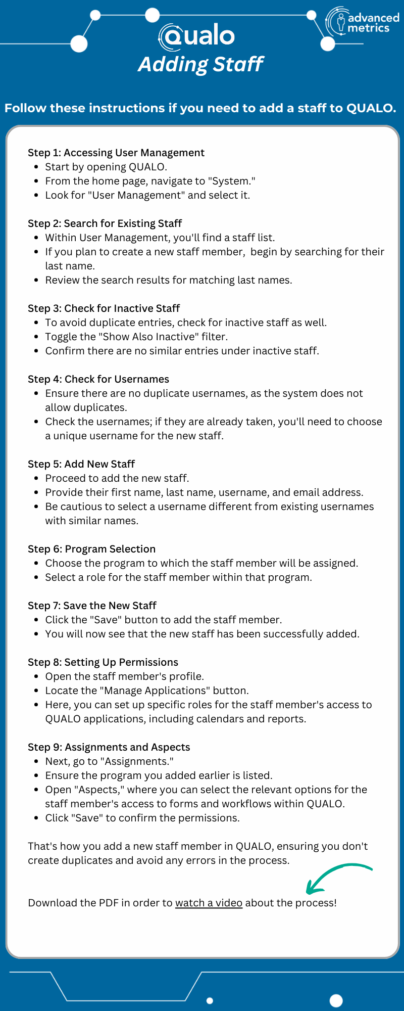As an Organization Admin, you will have the ability to delete staff members due to them no longer being needed in the QUALO system. Once the staff member is deleted, they will no longer be able to be accessed in QUALO. Optional: If staff member whom ...