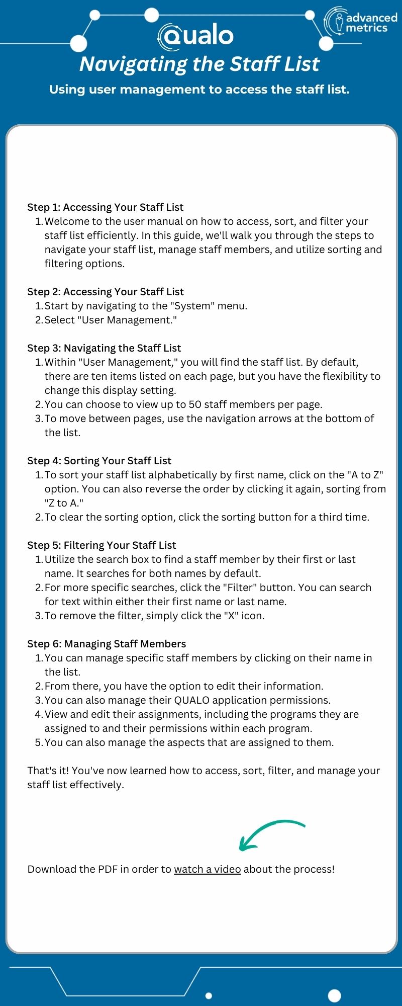 As an Organization Admin, you will have the ability to delete staff members due to them no longer being needed in the QUALO system. Once the staff member is deleted, they will no longer be able to be accessed in QUALO. Optional: If staff member whom ...