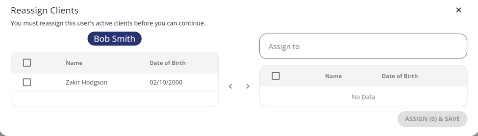 Optional: If the selected staff member has any active clients, the Reassign pop up will appear
