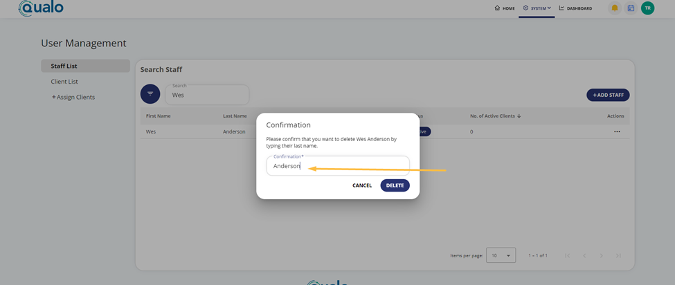 If the staff member doesn’t have any clients on their case load, a confirmation popup will appear. You must type in their last name in order to complete the delete process.